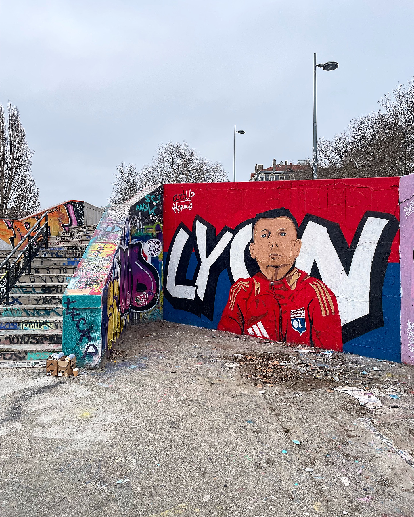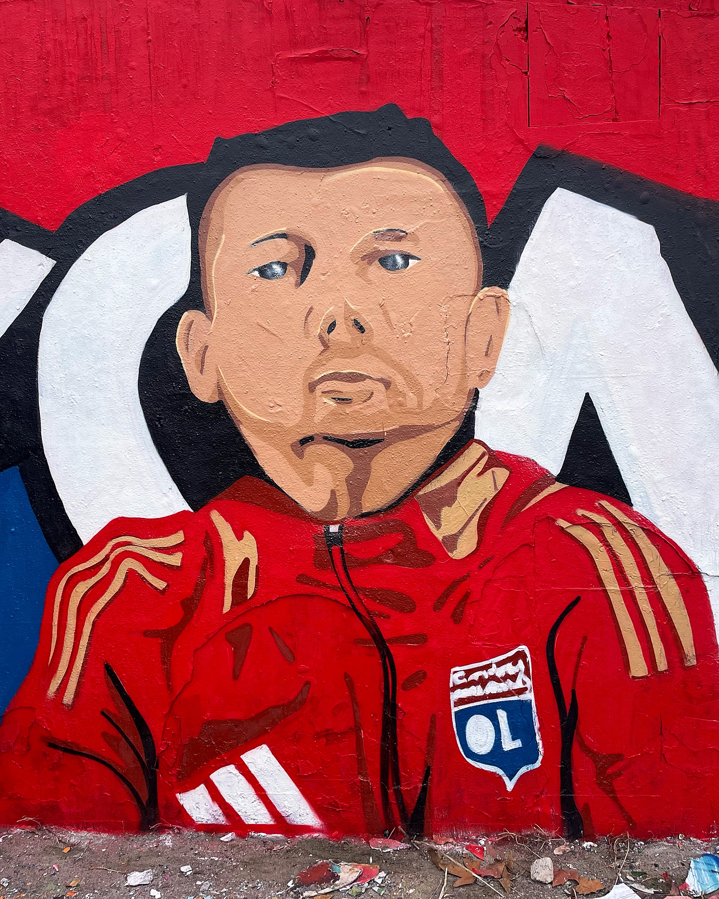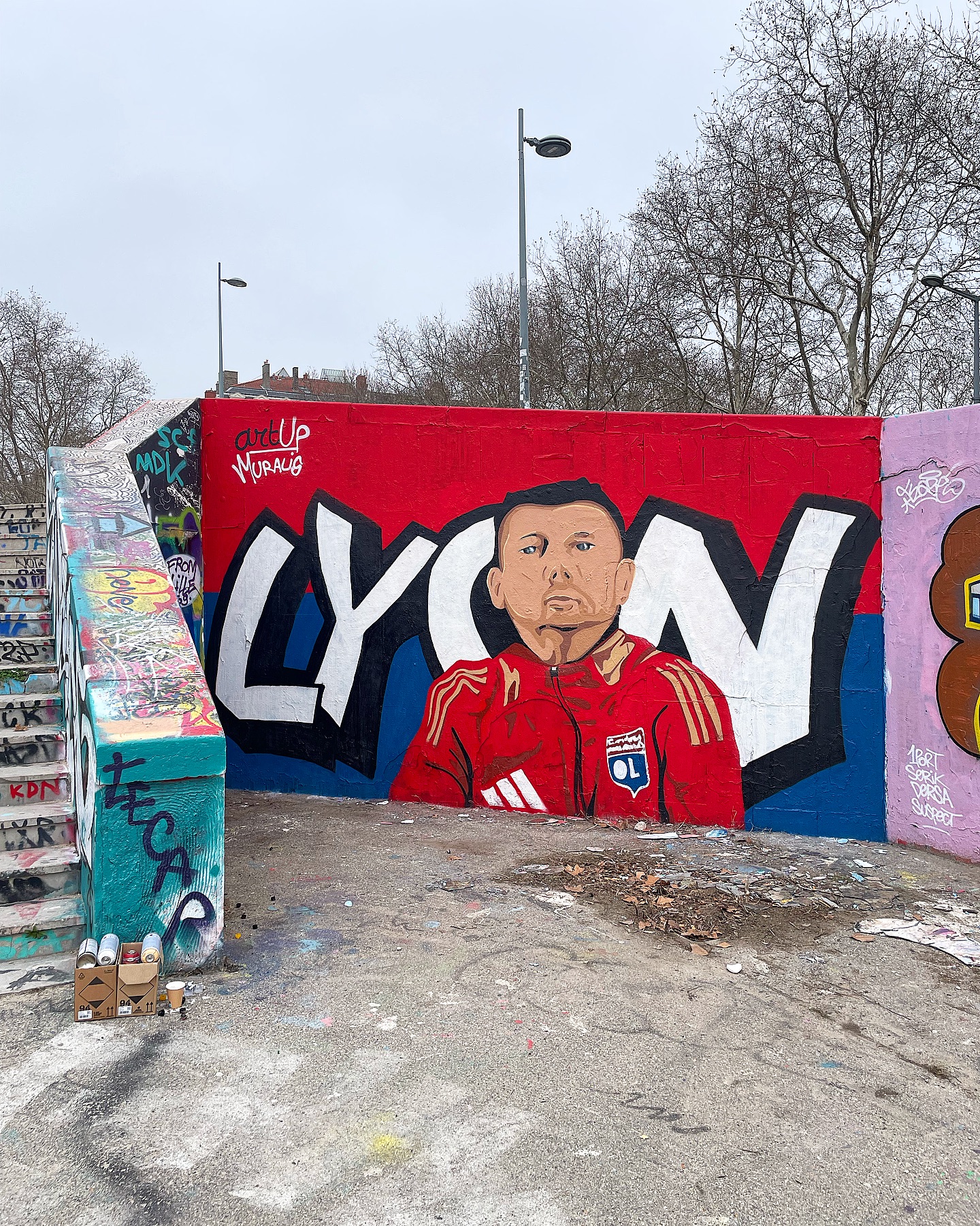 Réalisée à la bombe aérosol au skatepark des quais du 6ᵉ arrondissement, cette fresque est un hommage à Pierre Sage entraîneur dont l’engagement et la philosophie de jeu ont marqué l’OL, malgré son éviction soudaine. Plus qu’un simple portrait, cette œuvre est également un message adressé aux Lyonnais, passionnés de football et fidèles à leur club. Elle symbolise l’attachement aux valeurs du sport, à ceux qui les incarnent, et à l’histoire qui s’écrit bien au-delà du terrain.
