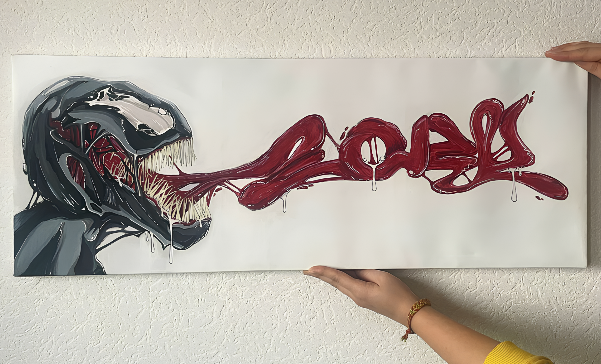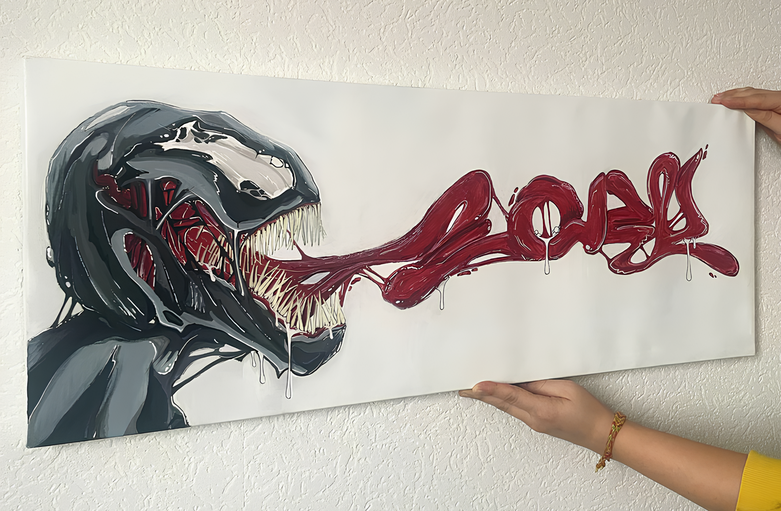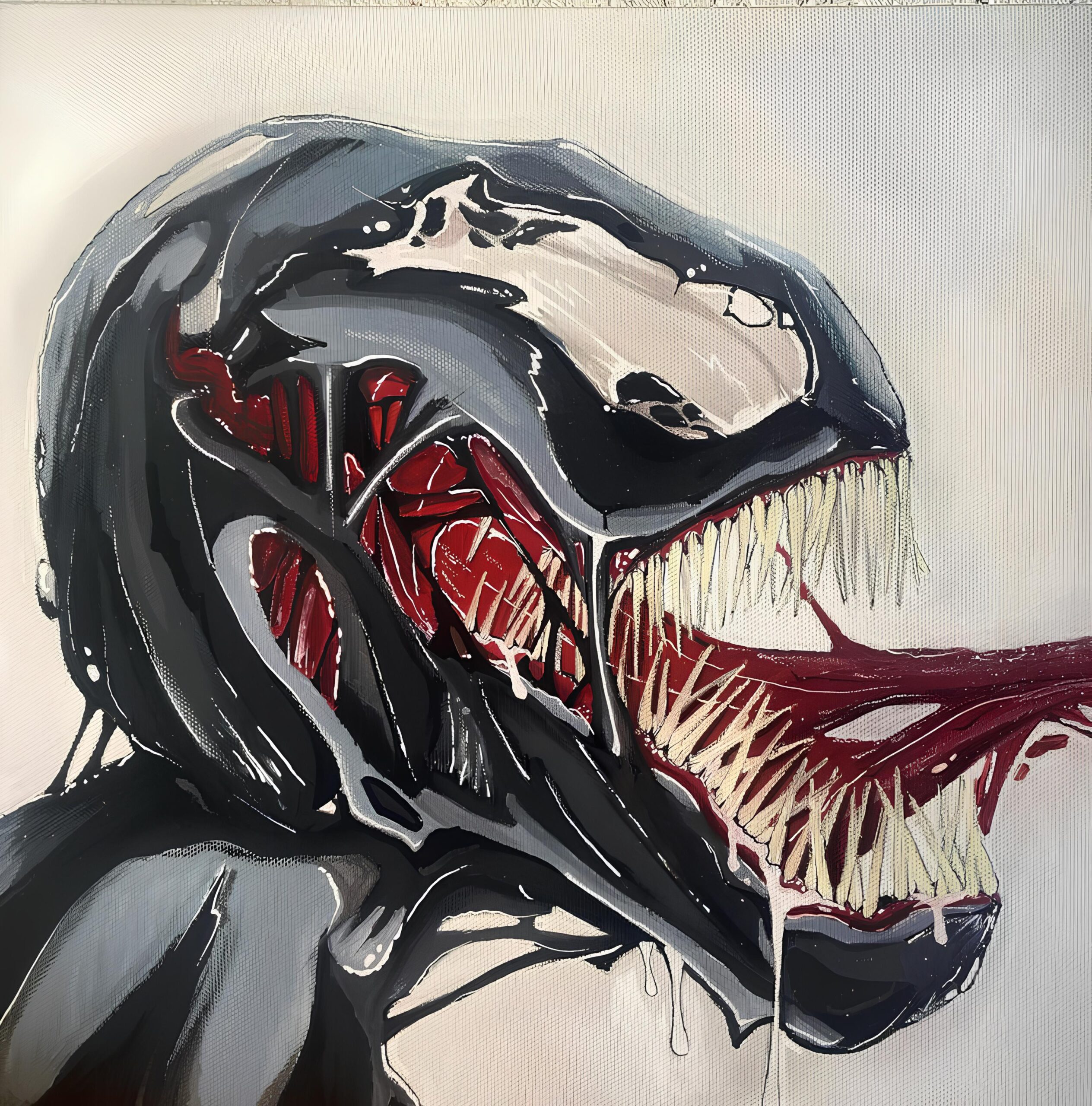 Peinture sur toile réalisée à l’acrylique au pinceau. Dans cette œuvre, j’ai revisité le personnage emblématique « Venom » de l’univers Marvel, en poussant à l’extrême ses caractéristiques physiques pour lui donner une dimension encore plus expressive. Sa langue, déjà célèbre pour sa longueur, a été volontairement amplifiée pour se transformer en un élément artistique et graphique : un graffiti, symbolisant l’énergie brute et l’expression urbaine. Ce détournement explore la frontière entre la fiction et l’art de rue, tout en offrant une vision personnelle et décalée de ce personnage iconique.