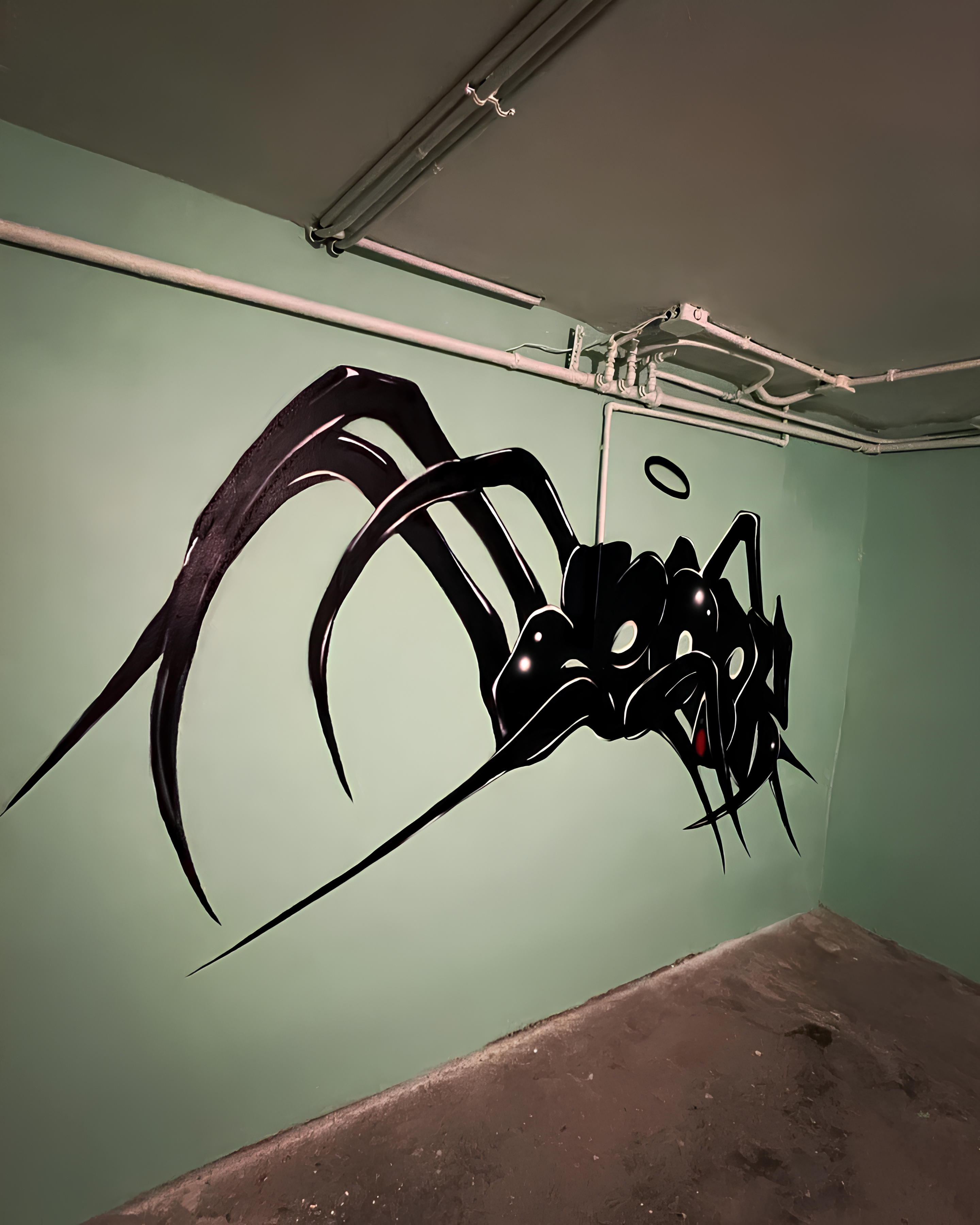 J’ai réalisé une fresque dans la salle de billard d’un sous-sol, représentant une veuve noire, inspirée par la passion du client pour les arachnides. Cette œuvre a une dimension particulière, car elle a été pensée non seulement pour sublimer l’espace, mais aussi pour aider le frère du client, arachnophobe, à surmonter progressivement sa peur des araignées. En choisissant de représenter l’araignée dans un cadre ludique et inattendu, la fresque invite à la confrontation de la phobie de manière artistique et symbolique. Le résultat est une pièce unique qui transforme la salle de billard en un lieu à la fois original, apaisant et thérapeutique, où l’art permet de surmonter des barrières personnelles dans le cadre du jeu.
